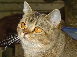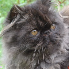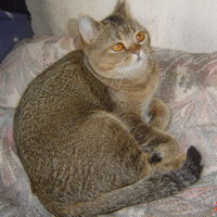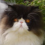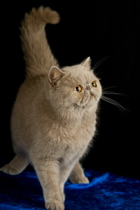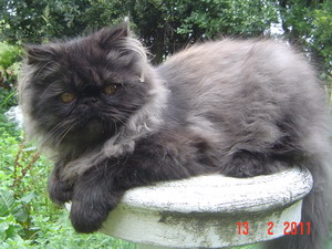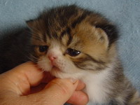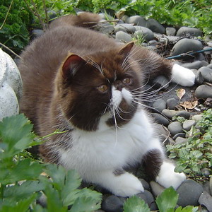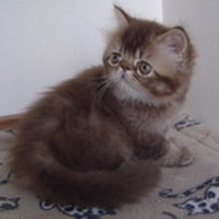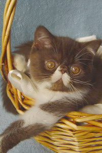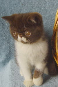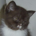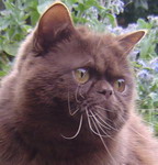 Eddie carries cinnamon and dilute. but not CP. Possibly homozygous for SH. Like my other chocolates he has been slow to mature, but at a year old is showing definite Exotic type This is the clown of the family, always ready for a game.