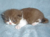 Type on all five kittens was quite variable. The best head type was the chocolate bicolour boy, but the three dilute bicolours were much chunkier in body type and had really thick plush coats. The cream boy's nose was slightly off centre, although improving as he matured. I would have preferred a girl to keep, but the one and only girl proved to be the ONLY one that didn't carry cinnamon. The overall best in the litter was the chocolate/W boy, so the decision was an easy one. I hope his ears get smaller as he grows!