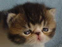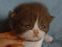 ROSIMORN WILLIE WONKA (Gen3) Chocolate Bicolour Exotic - aged 3 months below.Carries dilute,longhair and cinnamon. Does NOT carry CP. Wonderful head type with gorgeous big eyes with great depth of colour coming in, but a little long in body and tail at this stage. Ears are getting better.